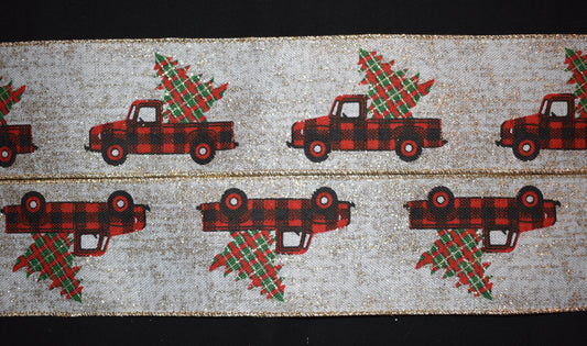 Red Plaid Truck Christmas Ribbon - 2 1/2 inch Printed Wired Polyester