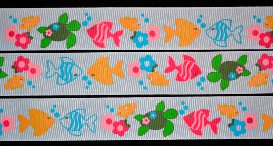 Fish and Turtle Ribbon - 7/8 inch Printed Grosgrain